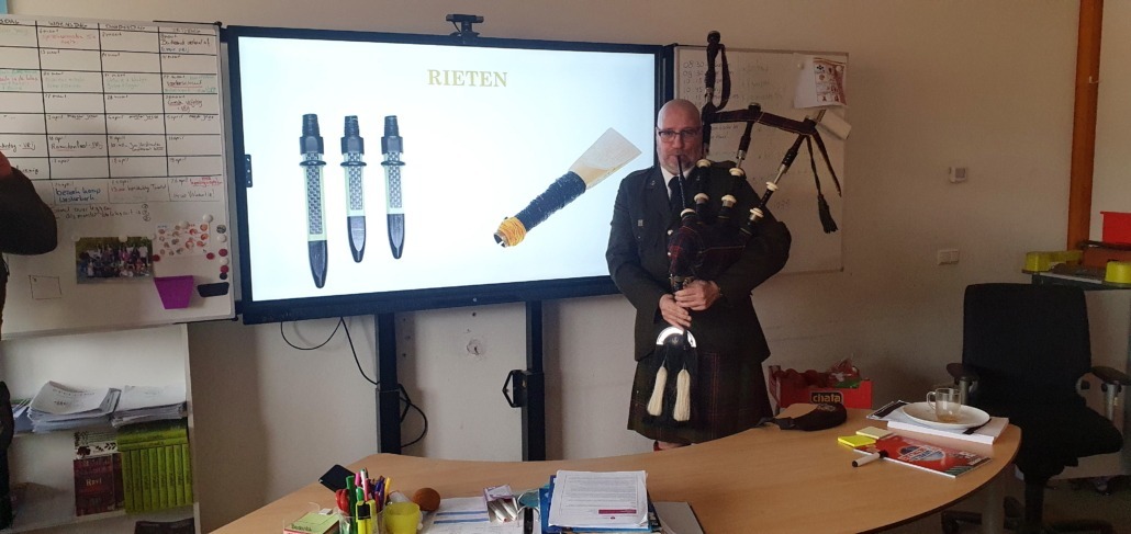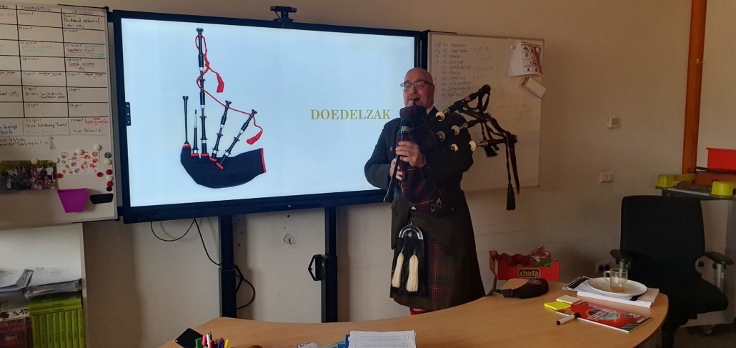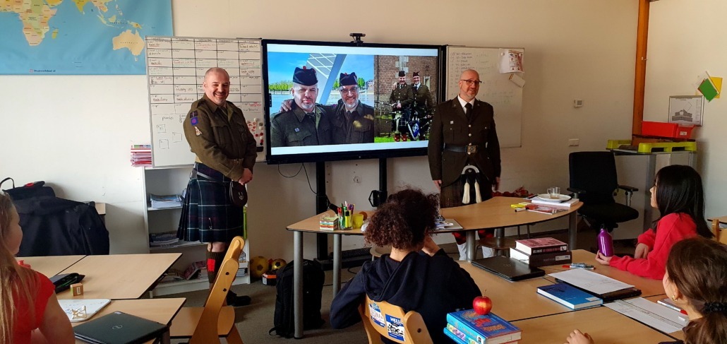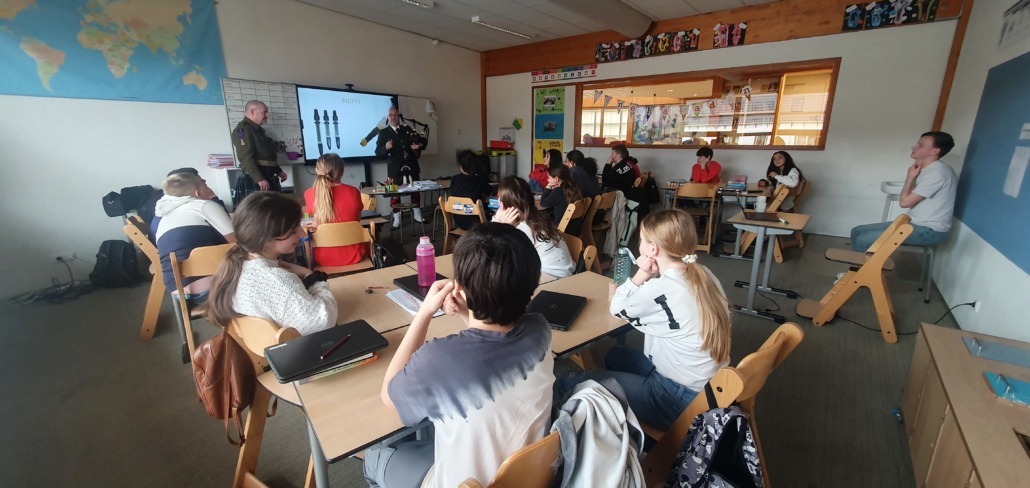 Met behulp van een PowerPoint hebben we iets verteld over onze band, The Highland Regiment Pipes and Drums. We spraken over onze kleding, onze instrumenten, maar ook over waarom we het belangrijk vinden om te herdenken. Vrijheid is nog steeds niet vanzelfsprekend, en de mensen die zijn gevallen in oorlogen hebben een groot offer gebracht: hun leven. Dat mogen we niet vergeten, vooral gezien wat er nu wereldwijd gebeurt.