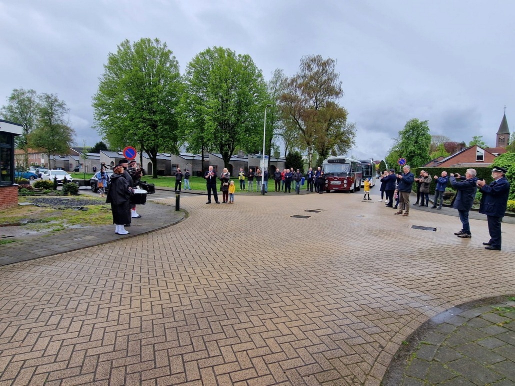 Het afscheid begon met een hartverwarmende verrassing: de vader werd van zijn bus gehaald en met een prachtige oldtimer naar huis gebracht. Terwijl de oldtimer naderde, liepen wij de laatste meters al spelend voor de bus uit, een eerbetoon aan zijn lange carrière.